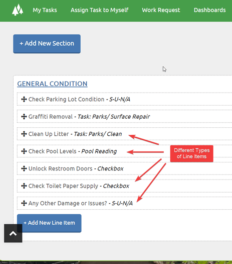 Each inspection is custom-built using a variety of line items. You can choose type of line item based on what you are checking or doing.
