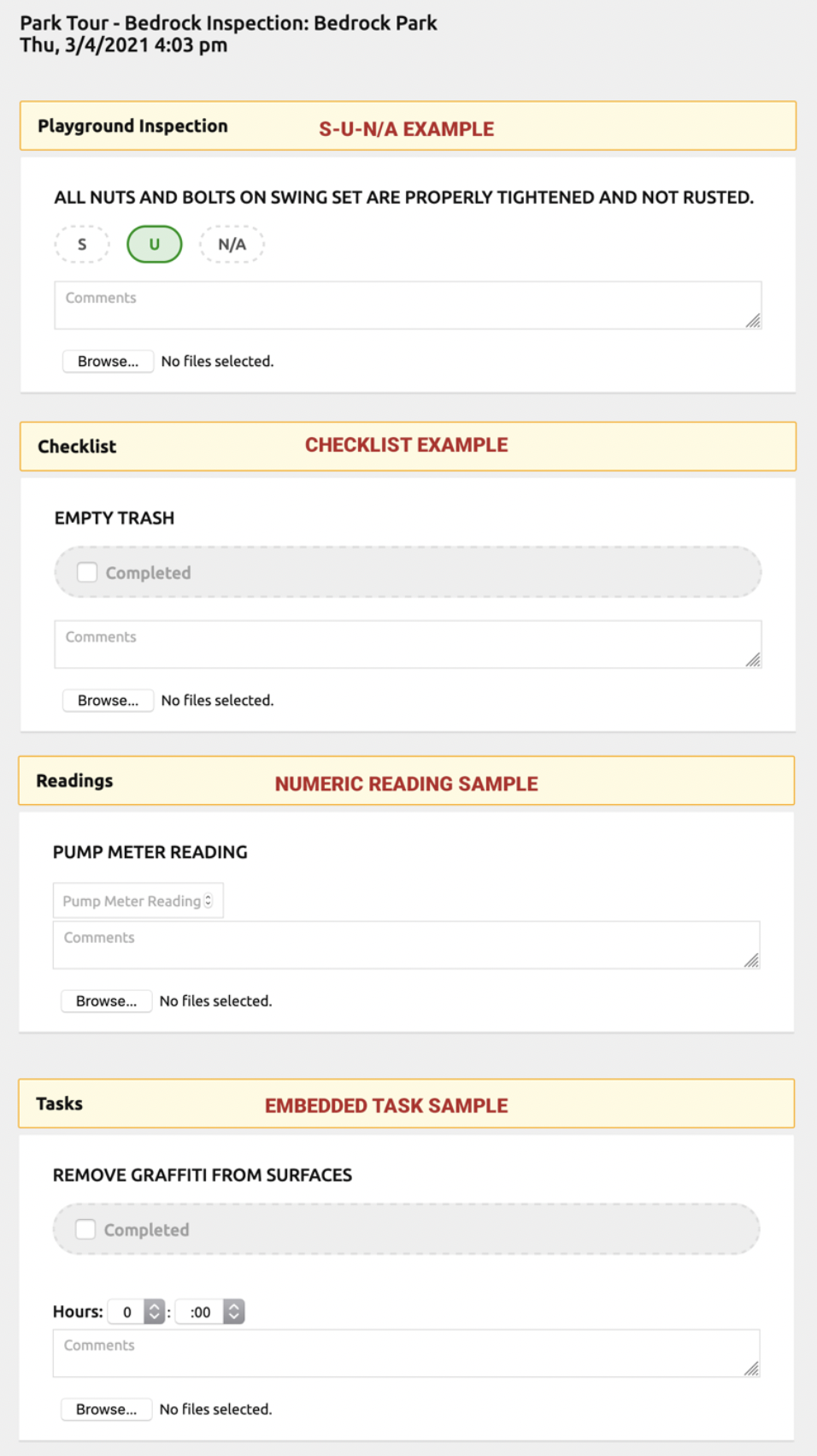 Use S-U-N/A for line items that require action if they do not meet Satisfactory conditions. Playground inspections or vehicle inspections are good examples of this type of line item. If an inspection line item is marked as Unsatisfactory, a work order will automatically be created. The supervisor responsible for that asset can then schedule corrective action as a task. When the corrective action task is completed the inspection will be updated to note the corrective action and can be saved and filed as complete.
